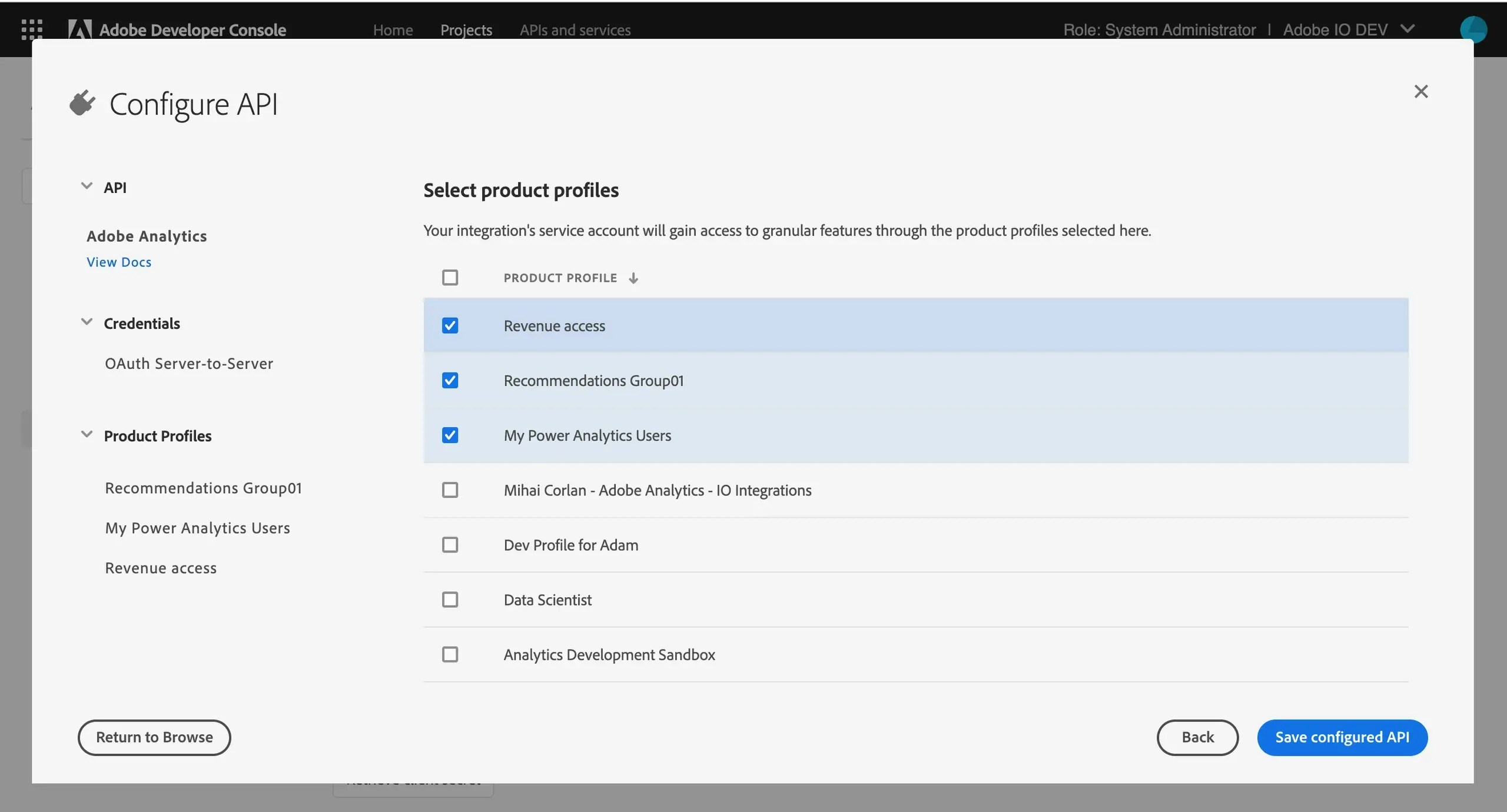 1. Select the product profiles that define the data your application can access.