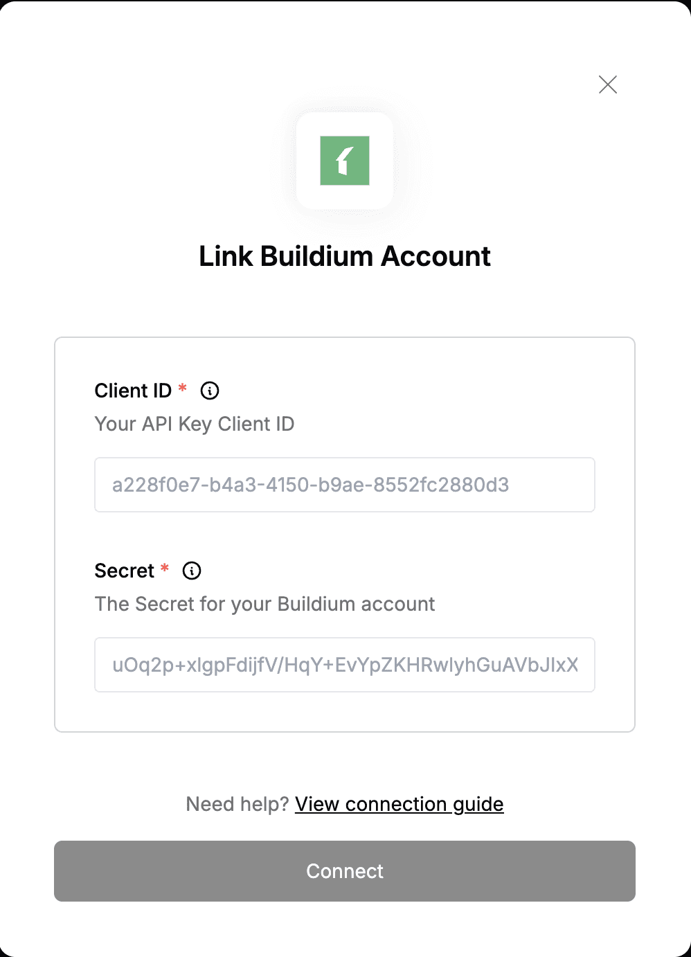 2. API Key - A secret key used in conjunction with the Client ID to grant Nango permission to access Buildium’s API resources and services.