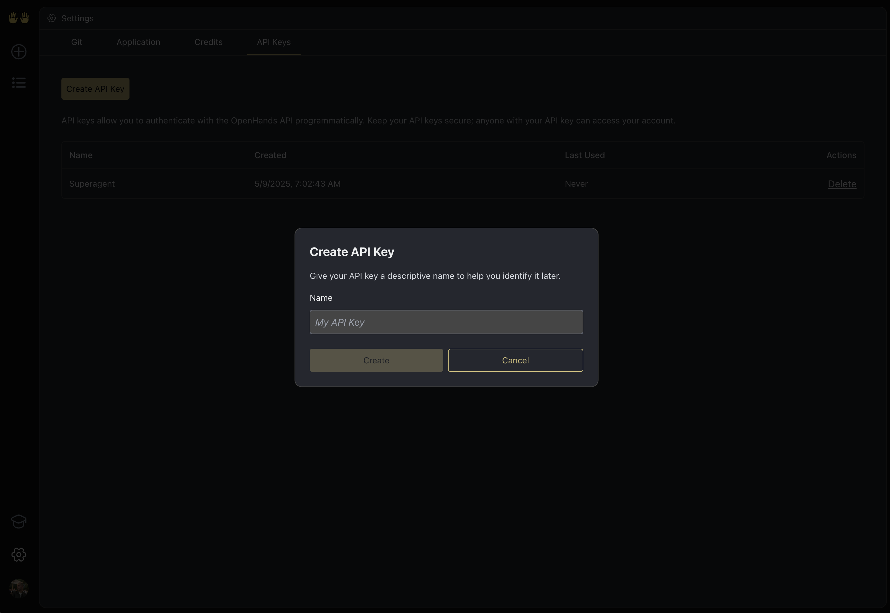 To authenticate with OpenHands, you need:- API Key - A key that grants Nango permission to interact with OpenHands’s APIs resources and services.