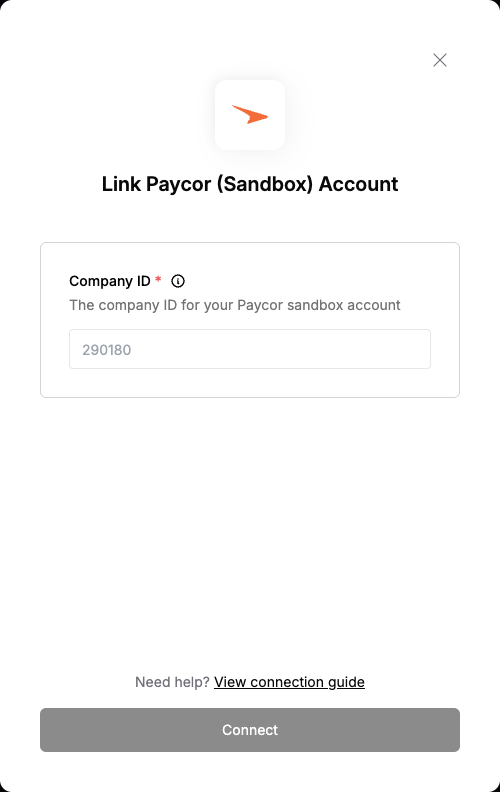 To authenticate with Paycor (Sandbox), you need:- Company ID - Your Paycor (Sandbox) company identifier