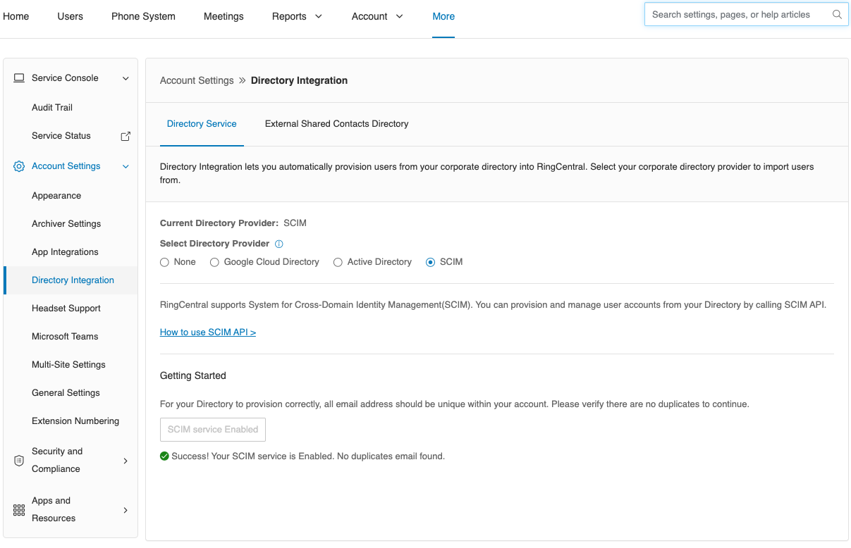 - If you want to provision users you have to enable the “Directory Service”. This can be found in the admin portal (https://service.ringcentral.com/) under “More” > “Account Settings” > “Directory Integration” and enable SCIM.