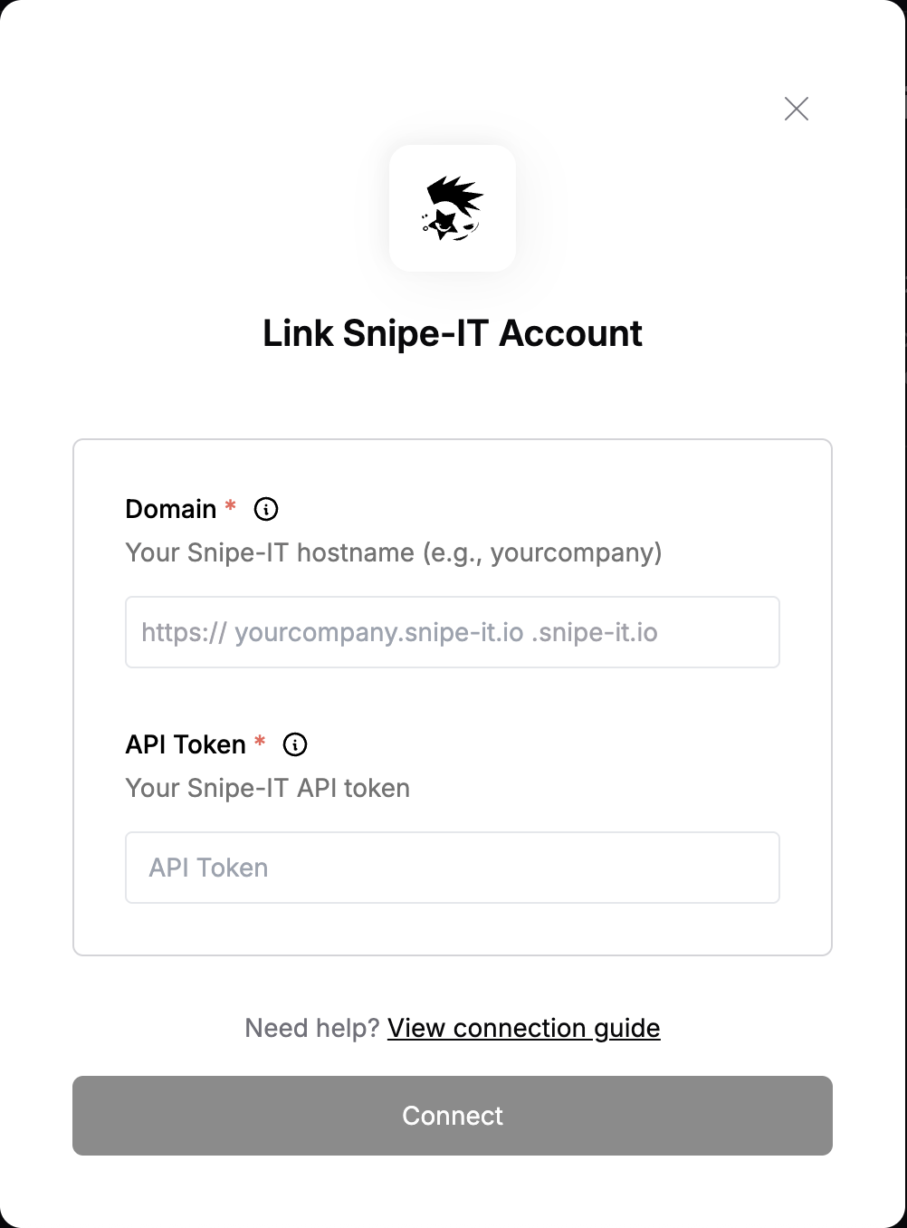 • You must have an account with Snipe-IT (either self-hosted or cloud instance).